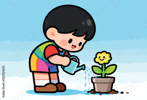 © Tibre, Naklejka premium A cartoon child waters a happy flower in a pot. The background is a sky with clouds