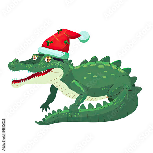 © jinn, Fototapeta premium A cartoon crocodile wearing a Santa hat