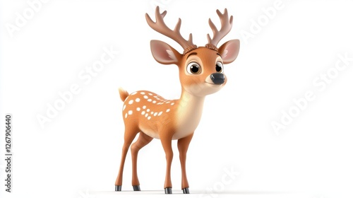 Fototapeta premium A cartoon deer with antlers stands on a white background. The deer has a happy expression on its face