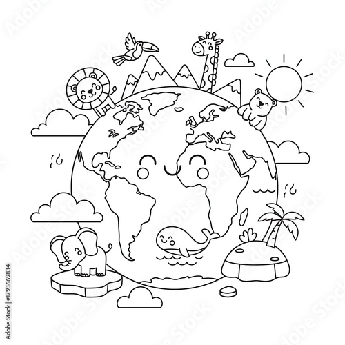 Obraz premium A cartoon drawing of Earth populated with animals and plants