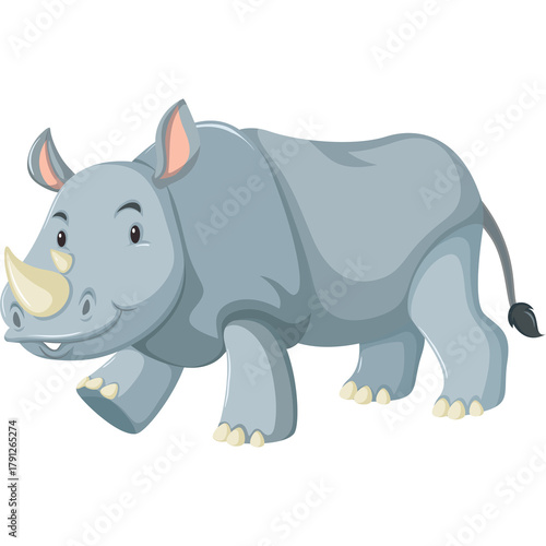 Fototapeta premium A cartoon gray rhinoceros with a beige horn and pink ears stands on a...