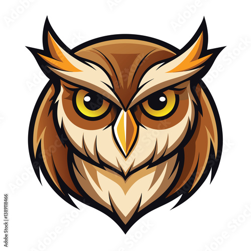 Fototapeta premium A cartoon illustration of a brown owls head with bright yellow eyes, set against a plain white background. The owl has a sharp, focused expression, suggesting intelligence and alertness.