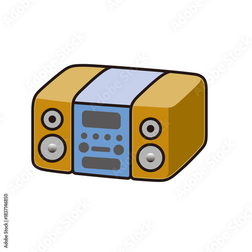 © yeri, Obraz premium A cartoon illustration of a compact stereo system with two speakers and a central control unit, depicted in orange and blue colors.