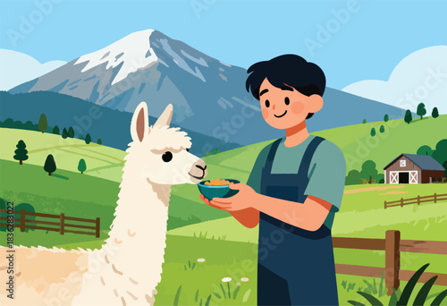 © Tibre, Naklejka premium A cartoon illustration of a man feeding a llama in a lush green landscape with a barn and mountain