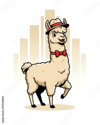 © SetCartoon, Obraz premium A cartoon llama wearing a hat and bow tie stands on a tan ground with building silhouettes