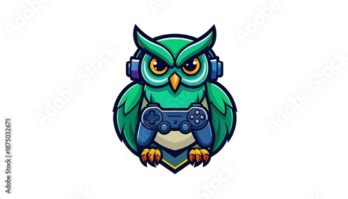 © Hanum, Obraz premium A cartoon owl wearing headphones holds a video game controller