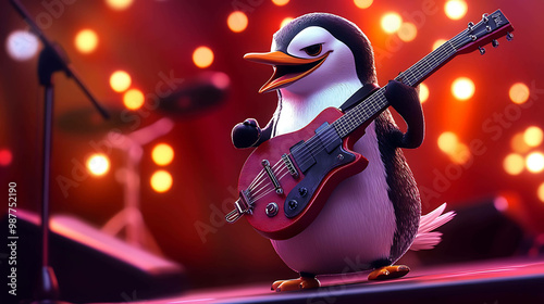 Obraz premium A cartoon penguin in a concert setting is playing a red electric guitar.