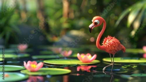 © Bimananda, Fototapeta premium A cartoon pink flamingo stands in a pond with lily pads and pink flowers.