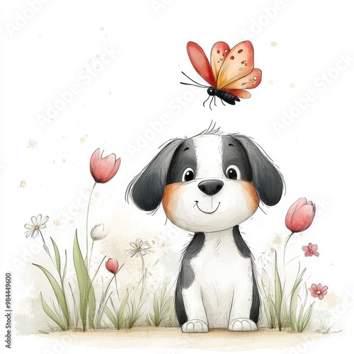 © Neuraldesign, Naklejka premium A cartoon puppy with floppy ears and a wagging tail in a tulip-filled field, chasing a colorful butterfly on a white background. A whimsical sketch ideal for kids' books and greeting cards.