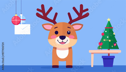 Fototapeta premium A cartoon reindeer stands beside a Christmas tree on a blue background