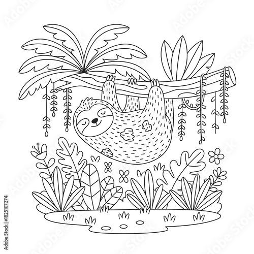 Obraz premium A cartoon sloth hangs from a tree branch surrounded by jungle plants and vines