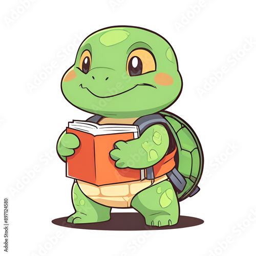 Fototapeta premium A cartoon turtle is holding a book and smiling