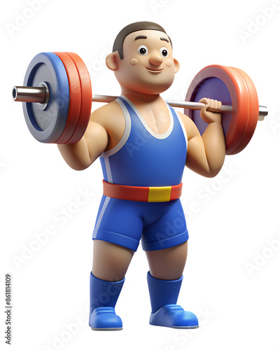 Obraz premium A cartoon weightlifter in blue athletic wear holds a barbell aloft, grinning confidently