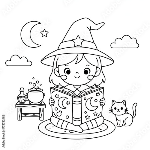 Naklejka premium A cartoon witch reads a book with a cat cauldron and celestial elements