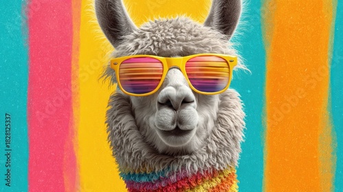 © mila103, Naklejka premium A cartoonish image of a llama wearing sunglasses and a scarf. The image has a fun and playful mood, with the bright colors of the scarf and the sunglasses adding to the overall cheerful atmosphere
