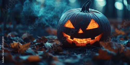 Fototapeta premium A carved Halloween pumpkin sits atop a pile of colorful leaves, perfect for...