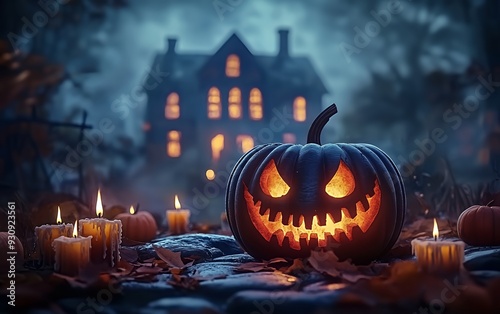 Fototapeta premium A carved jack-o-lantern with a menacing grin sits in front of a spooky, darkened house with lit windows and surrounded by candles, dry leaves, and other pumpkins in the foggy, night air.