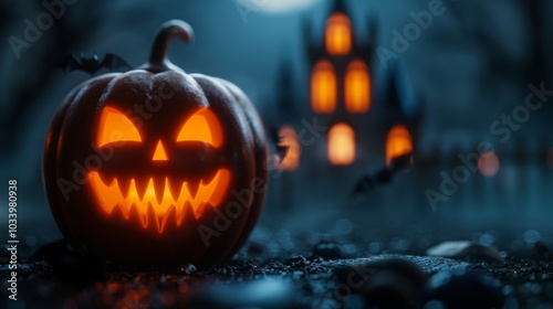 Naklejka premium A carved pumpkin lights up with a menacing grin beside a dark castle under a...