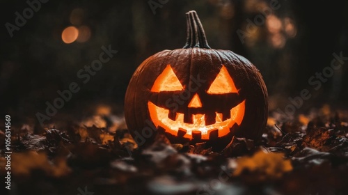 © Katarina, Naklejka premium A carved pumpkin with a glowing face sits amidst fallen autumn leaves, capturing a spooky and traditional Halloween atmosphere in the darkness of night.