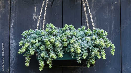 Fototapeta premium A cascading donkey tail succulent growing in a hanging basket, its lush green stems creating a dramatic and elegant display.