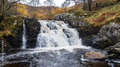 Naklejka premium A cascading waterfall flows over rocks in a forest with autumn colors and a...