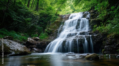 © Mnur, Fototapeta premium A cascading waterfall surrounded by lush green forest vegetation environment