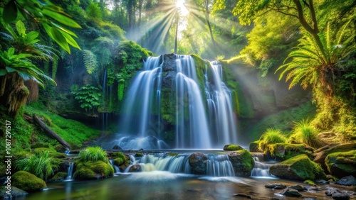 Obraz premium A cascading waterfall tumbles through a lush, verdant forest, illuminated by...