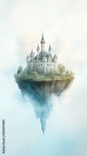 Naklejka premium A castle is floating in the air above a body of water