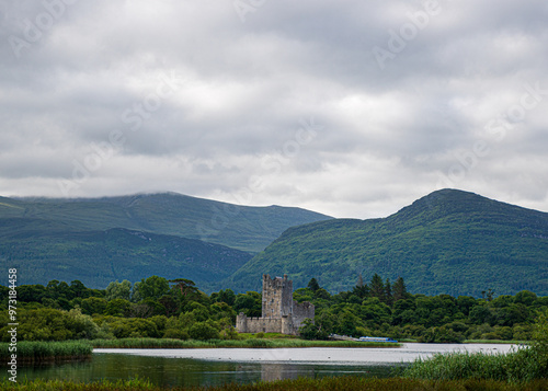 © Joshua, Fototapeta premium A castle is in the distance behind a mountain range
