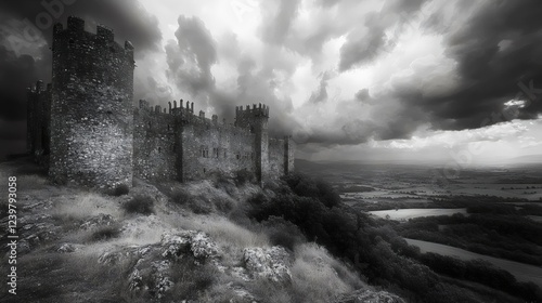 © Linus, Fototapeta premium A castle is shown in the distance with a cloudy sky above it