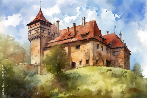 © Etverk Illustration, Obraz premium A castle with a moat Generative AI
