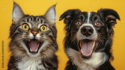 © Ayan, Obraz premium A cat and a dog with big smiles, looking excited about something.