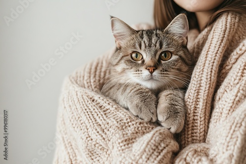© venusvi, Naklejka premium A cat and owner in matching outfits, on solid white background, single object