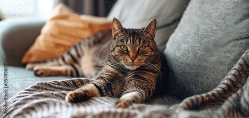 © MstRoksana, Obraz premium A cat is laying on a bed with the word cat on the front.