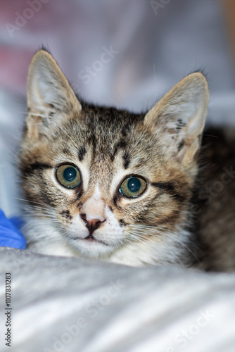 © Vera Aksionava, Fototapeta premium A cat is on a table with a blue box marked with the number 5