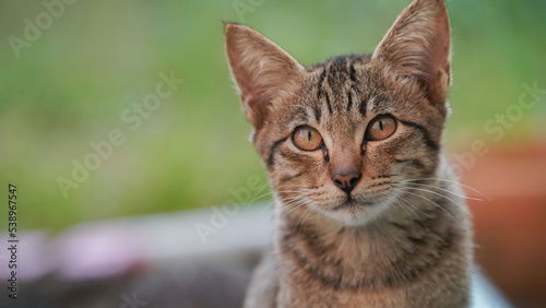 Fototapeta premium A cat looking into the camera. portrait of a grey cat with stripes laying on...