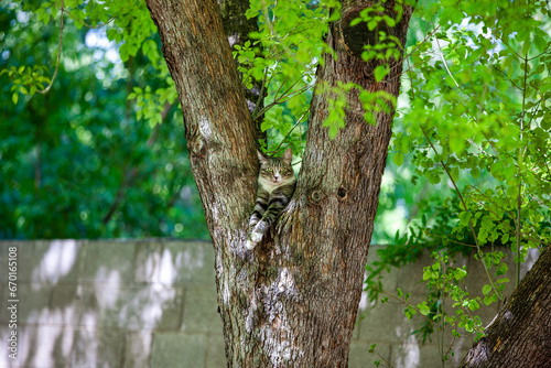 © tim, Obraz premium A Cat named Gladys comfortable in a Tree birdwatching
