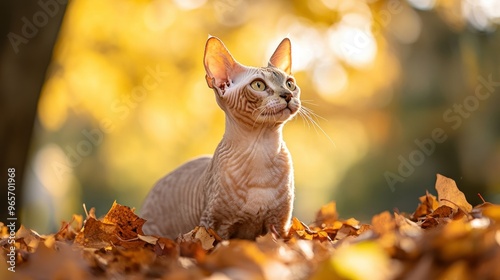 © BerkahStock, Fototapeta premium A cat sits among autumn leaves, gazing thoughtfully in a serene outdoor setting.