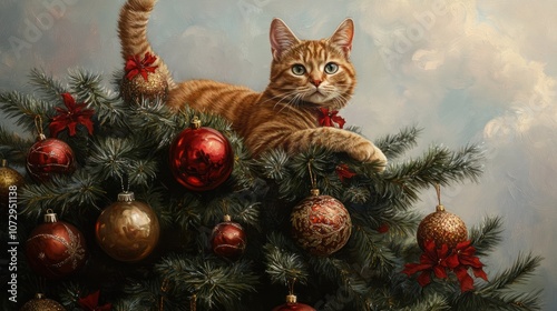 © Johannes, Obraz premium A cat sitting on top of a christmas tree with ornaments