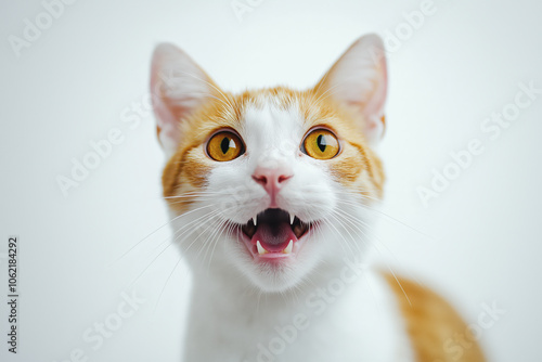 © WETDREAM, Fototapeta premium A cat with a white face and orange fur is smiling and making a funny face