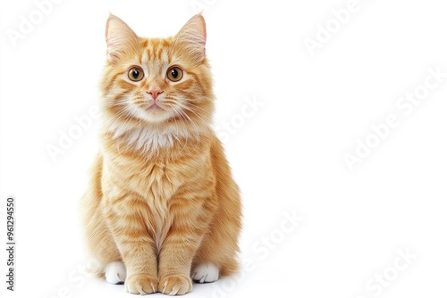 Obraz premium A cat with orange fur is sitting on a white background. The cat has a curious...
