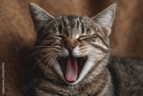 © mizmizstk, Obraz premium a cat yawns while sitting on a couch
