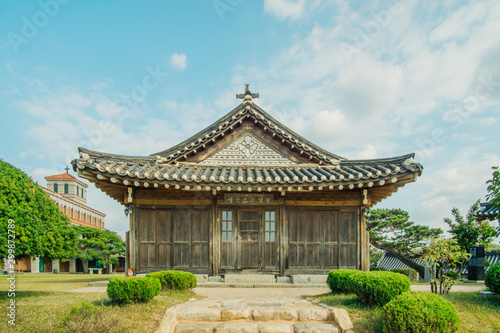 © Sewon, Fototapeta premium A Cathedral built in Korean traditional architecture style on a fine day.