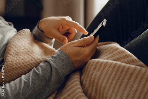 Fototapeta premium a caucasian man relaxing, using smart phone lying in bed under throw at home
