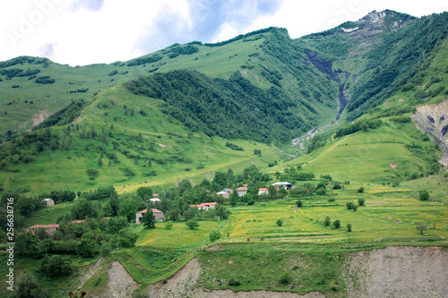 Fototapeta premium A caucasian mountain landscape. A valley and a green pasture. The Georgia, Caucasus.
