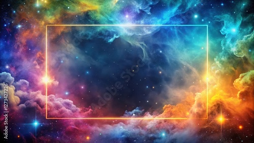 Obraz premium A Celestial Canvas Glowing Golden Frame Envelops Vibrant Nebulae and Sparkling Stars