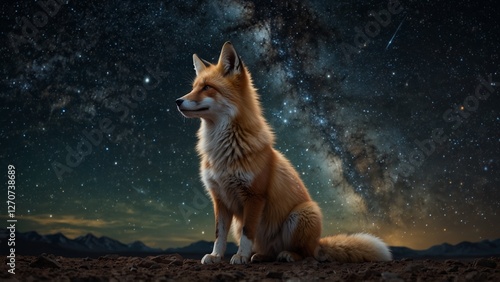 Fototapeta premium A celestial fox with luminous constellations on its fur, standing beneath the Milky Way.
