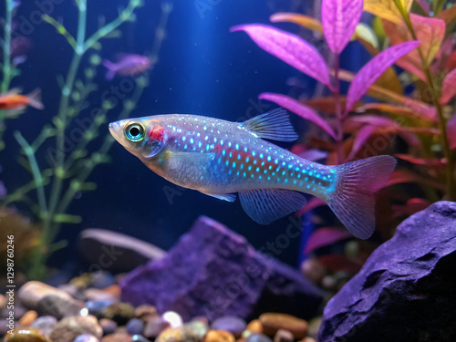 Fototapeta premium A celestial pearl danio, its speckled body glowing under soft, colorful underwater lighting