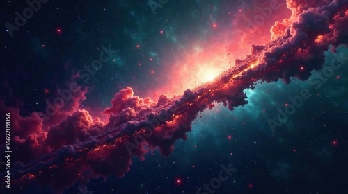 Fototapeta premium A Celestial River of Crimson Clouds Flows Through a Starry Expanse, Illuminated by a Distant, Glowing Nebula