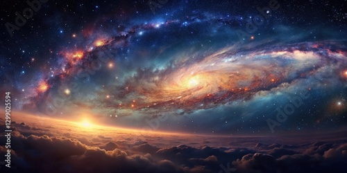 Fototapeta premium A Celestial Tapestry Sunrise Over a Planet with a Spiral Galaxy in the Night Sky